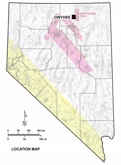The project is situated on the east flank of the Tuscarora Mountains and along the western margin of the Independence Valley in northern Elko County. The Owyhee claims are located eleven miles west of the Jerritt Canyon District and six miles north of Tuscarora. Elevations range from 6000 to 6600 feet (1928-2011 m).